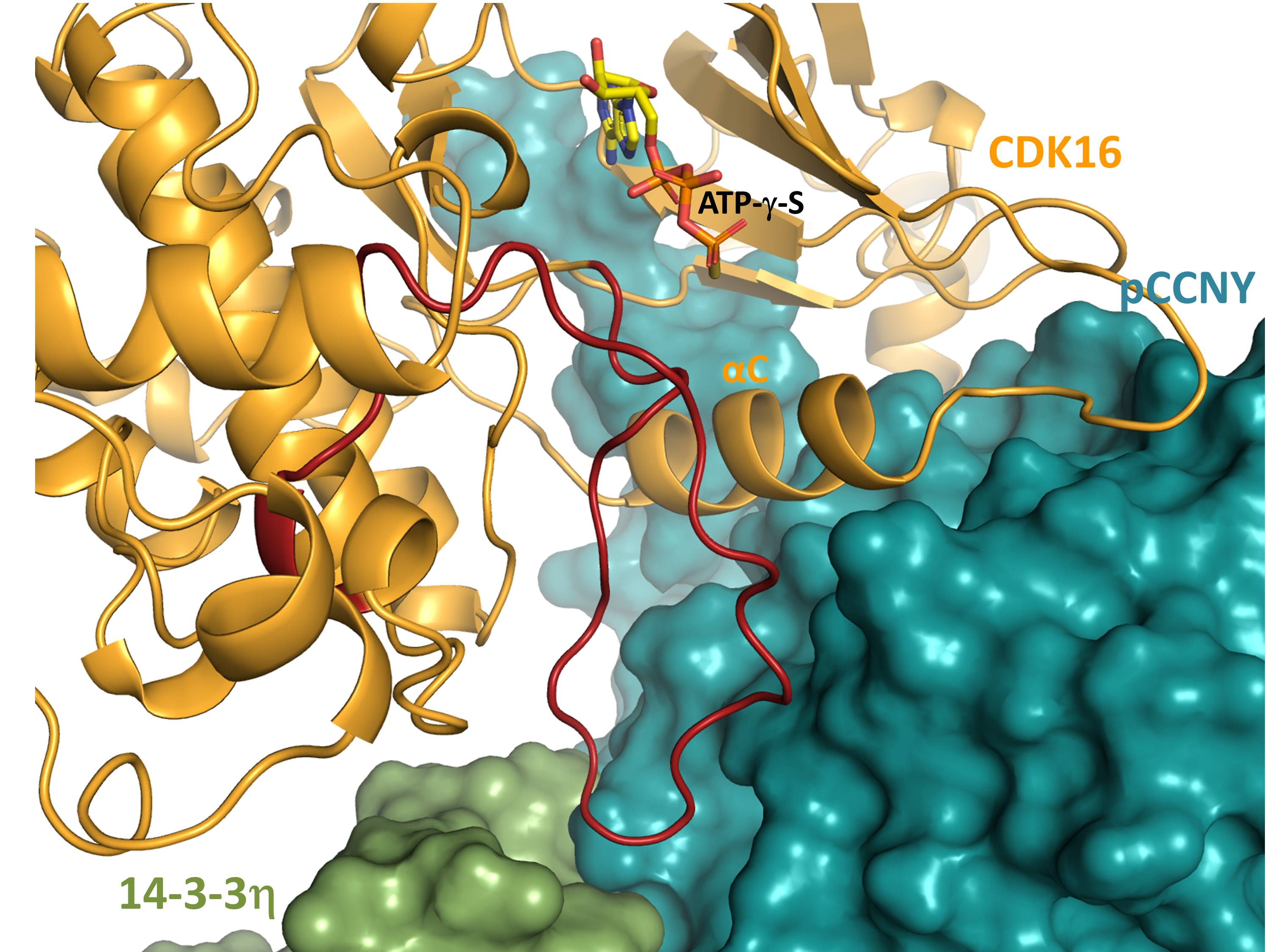 A key region of the binding interface between CDK16, pCCNY and 14-3-3. The activation segment of CDK16 (residues 304-331, shown in dark red) adopts an ordered conformation stabilized by intra- and intermolecular interactions with pCCNY and 14-3-3 (shown in surface representation).