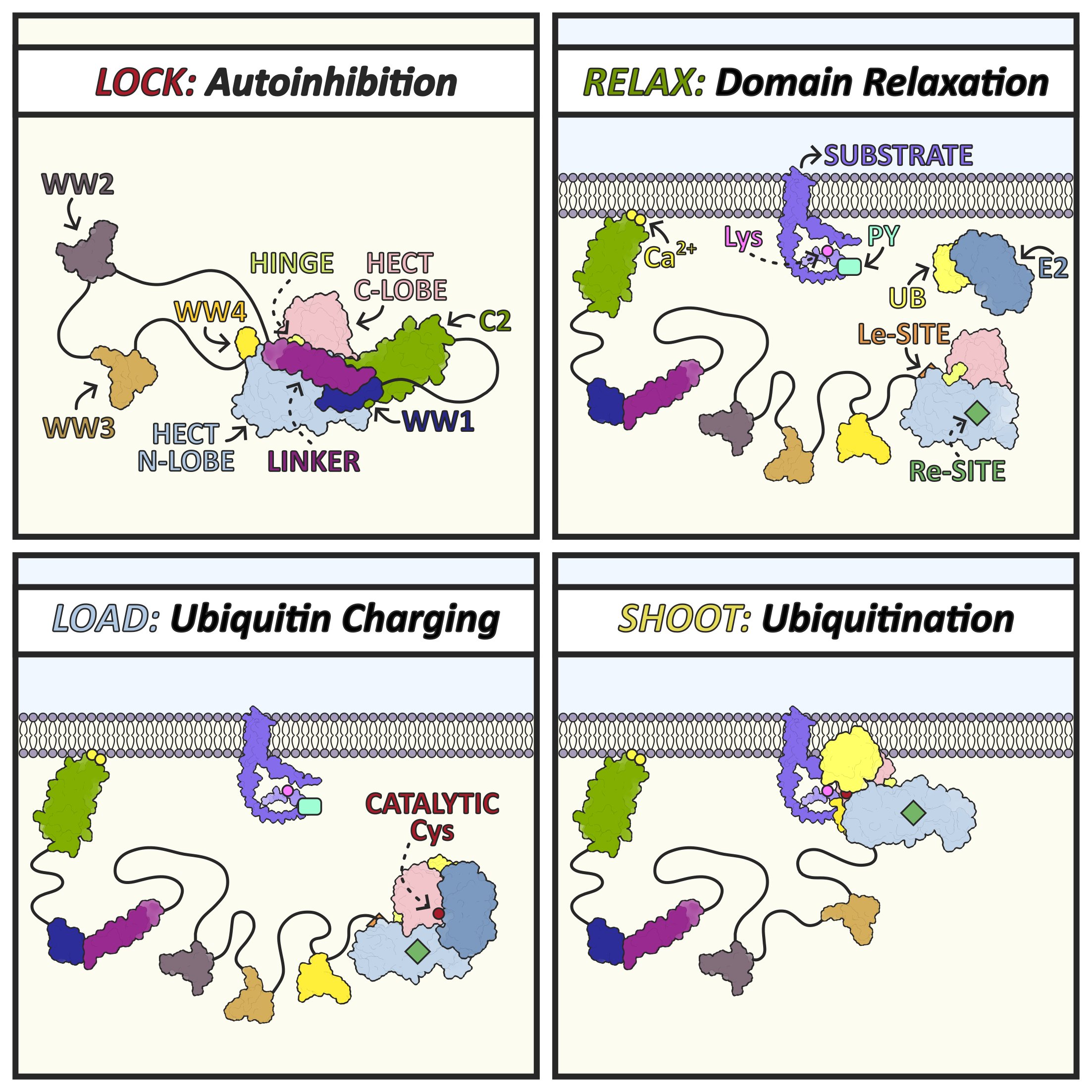 Structural basis of inactive and active states of the Nedd4 HECT E3 ligase subfamily, following a “lock, relax, load, and shoot” mechanism. In the locked, autoinhibited state, intramolecular domain interactions restrain the HECT domain. Relaxation releases these restraints, allowing loading of ubiquitin onto the catalytic cysteine, followed by the “shoot” step of (auto)ubiquitination. Nedd4 ligases regulate diverse cellular pathways, making them important targets for mechanistic and pharmacological studies.