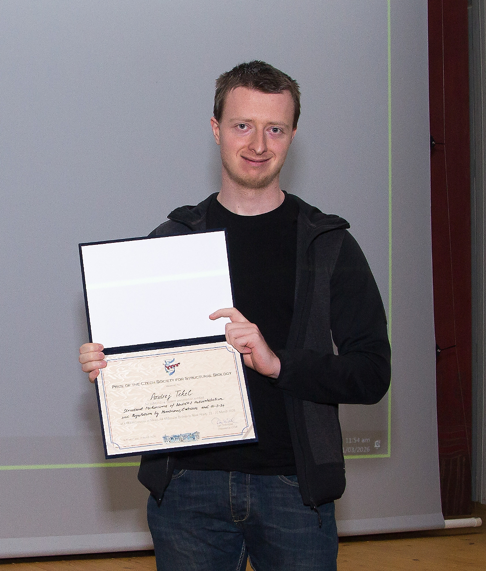 Andrej Tekel received the Czech Society for Structural Biology prize for an outstanding student presentation at the XXII Discussions on Structural Molecular Biology & 9th CIISB User Meeting, held on 19–21 March 2026 in Nové Hrady, for his talk "Structural Mechanisms of Nedd4-2 Autoinhibition and Regulation by Membranes, Calcium and 14-3-3η".